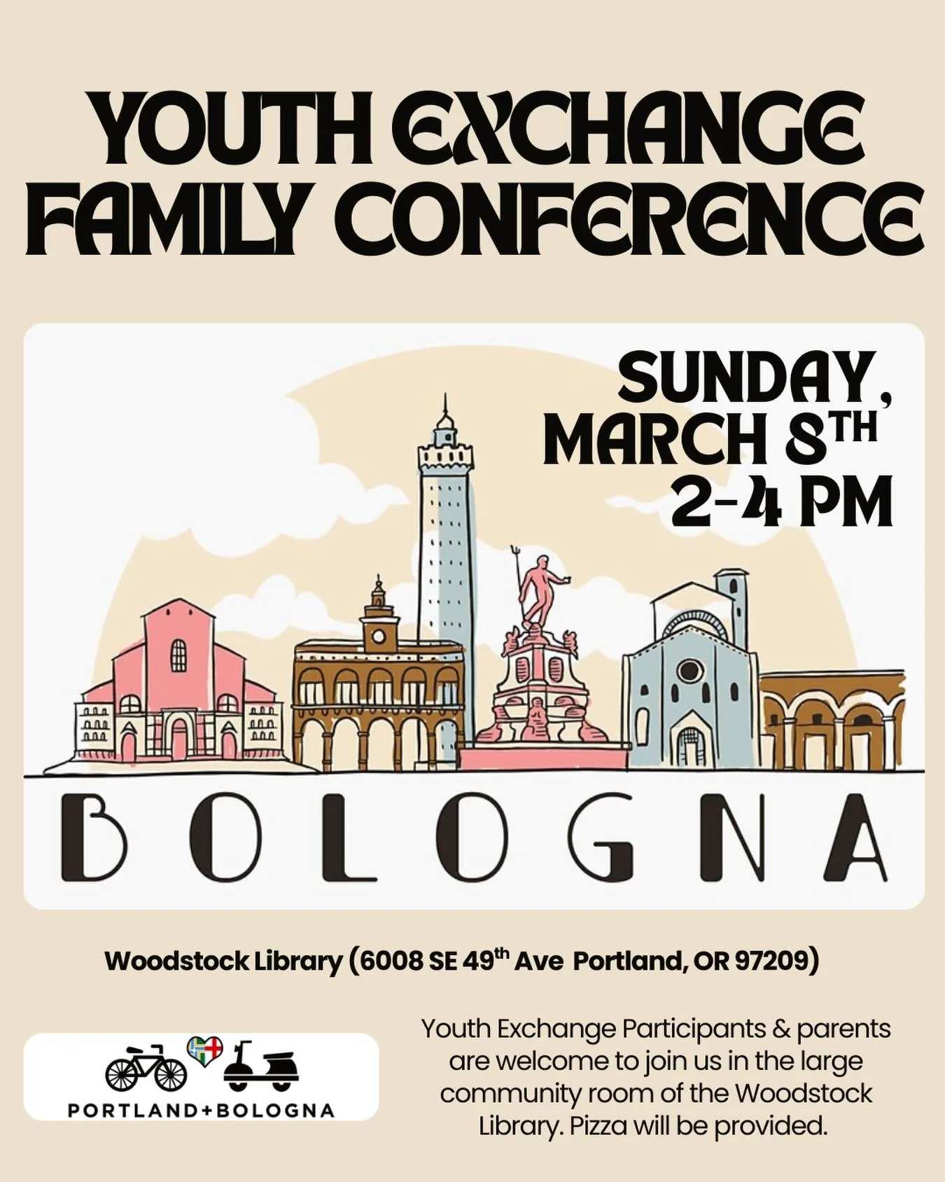 The Portland-Bologna Youth Exchange Program is a two-year cycle. We are resuming the program in Summer 2026—first sending Portland students to Italy then hosting students from Bologna in 2027. Applications for 2026-27 are open and we invite you to visit our Youth Exchange page!