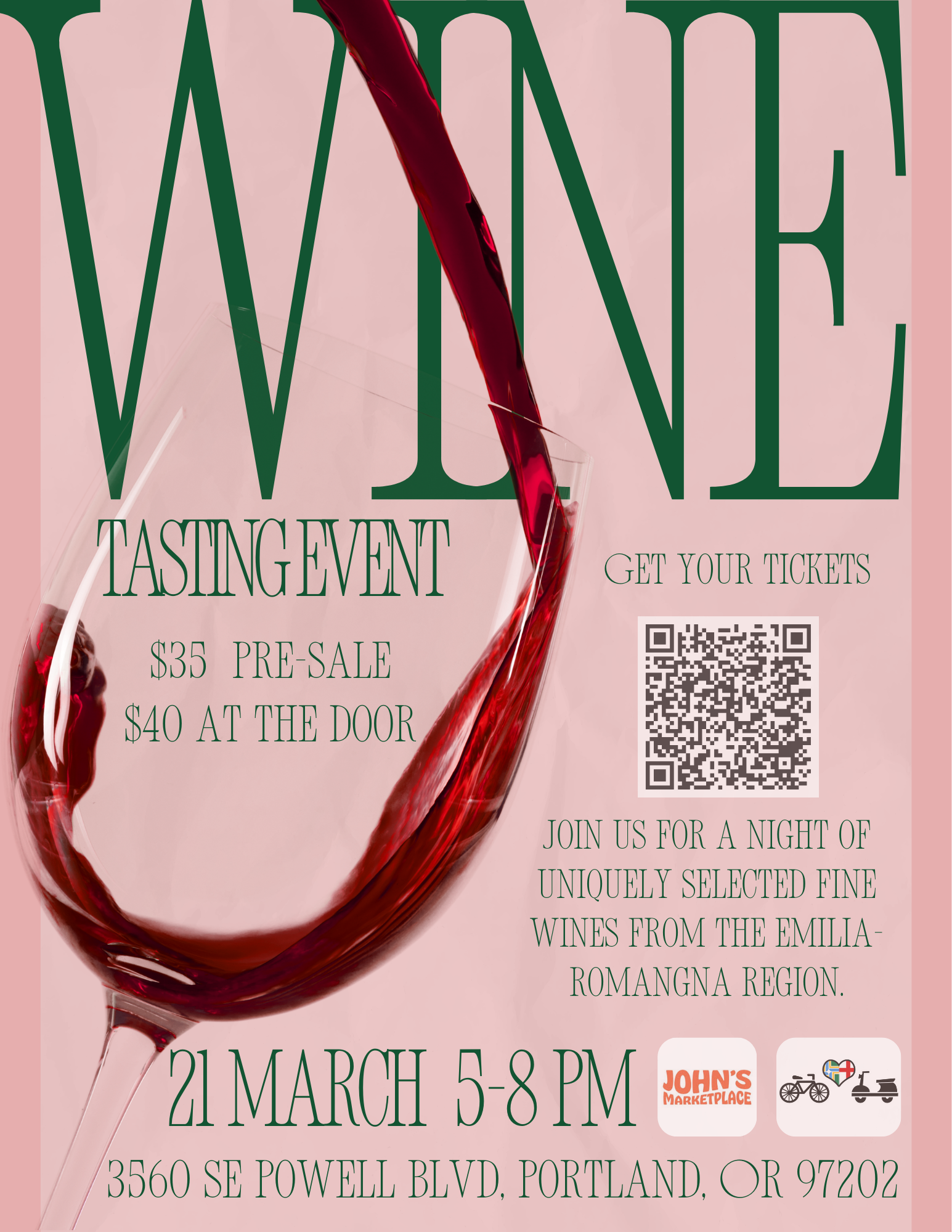 Calling all wine lovers! We are returning to John’s Marketplace to try specially selected wines from the Emilia-Romagna region on Saturday, March 21st from 6-8 PM. Seating is limited so get your tickets!